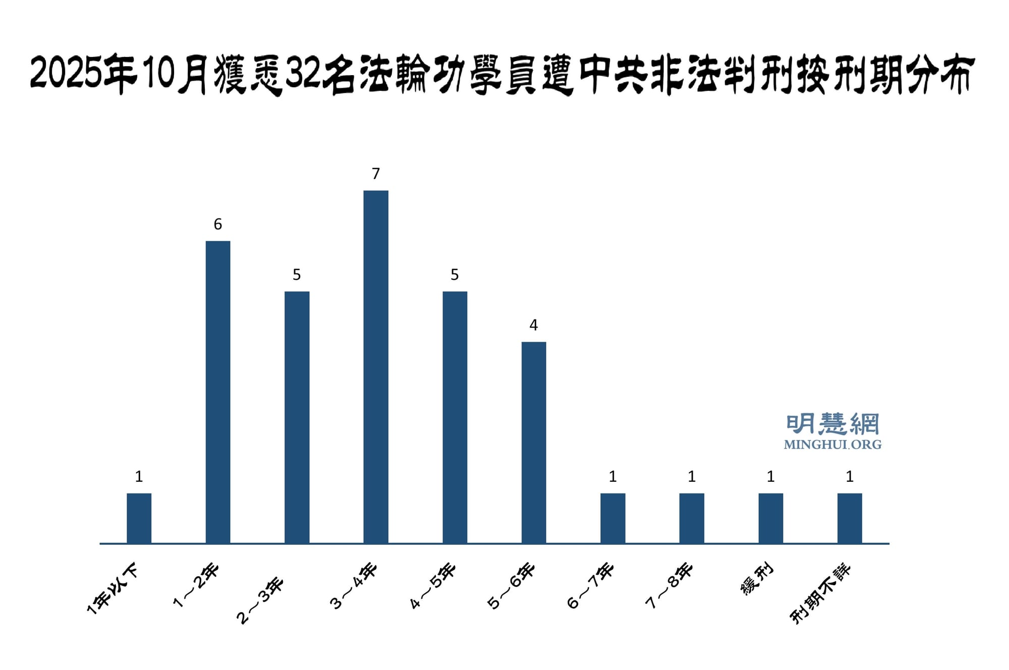 據明慧網報導統計,今年十月份獲知又有32名法輪功學員被非法判刑;有17個省、自治區、直轄市參與迫害。迫害最嚴重地區依次為:吉林省6人,山東省4人;北京市、黑龍江省各3人;廣東省、河北省、浙江省各2人。