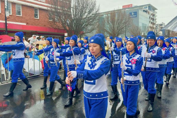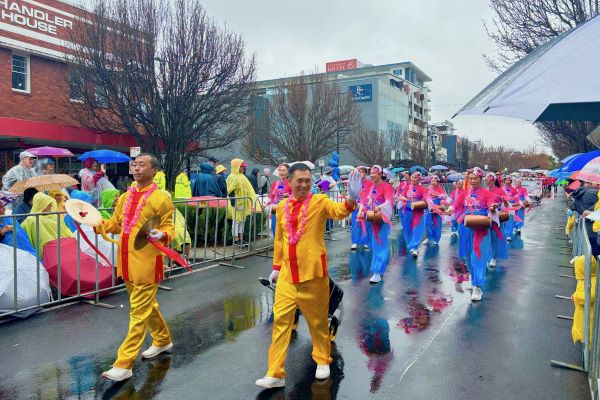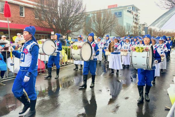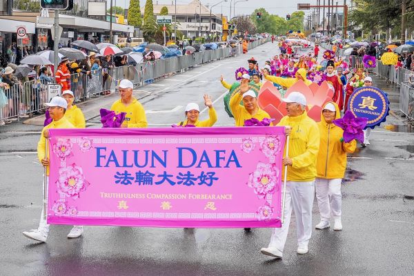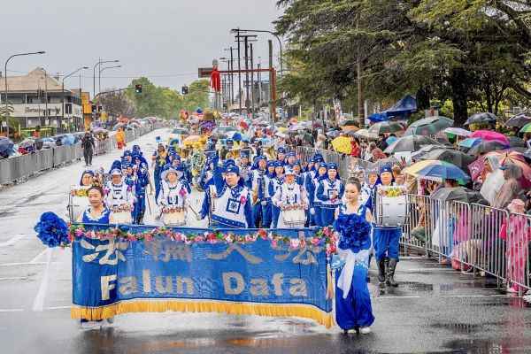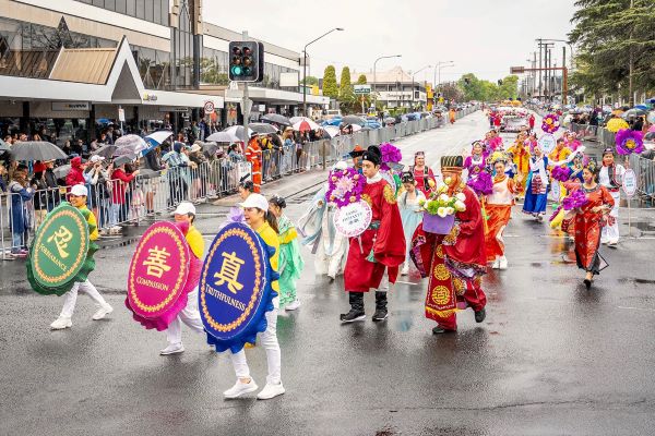「現在登場的是澳洲法輪大法協會昆士蘭分會。(我們)非常榮幸他們能參與中央花車遊行,自一九九九年起至今(他們)持續參與遊行。」