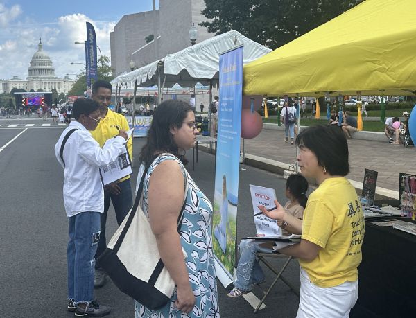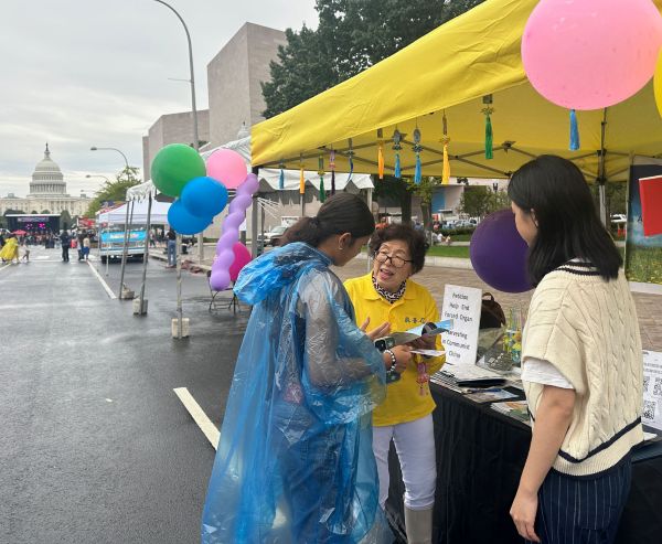 同一週末,首都華盛頓的拉丁文化嘉年華(Fiesta DC)在賓夕法尼亞大道上登場,以現場音樂、舞蹈表演、琳瑯滿目的手工藝品、正宗的拉丁美洲美食,吸引各族裔民眾。其中,法輪功展位與所有展位都不一樣,帶來一種寧靜舒適的感受。