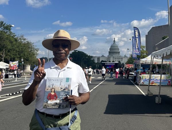 華盛頓居民基思・韋伯斯特(Keith Webster)兩度來到法輪功展位。他說,他早就聽說過法輪功及其長期遭受中共迫害、學員被活摘器官的情況,「這場迫害很糟糕,這也很可悲。」
