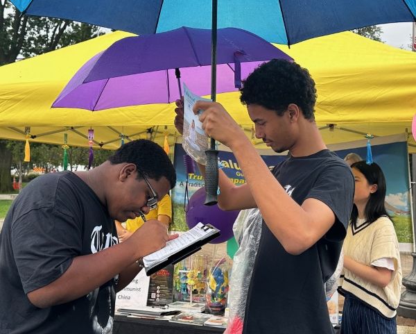 張先生在活動第一天清晨剛剛從中國浙江省抵達美國,當天下午,他在法輪功展位前停留了好長時間,一位曾因不放棄信仰被中共關押的法輪功學員跟他講了真相。