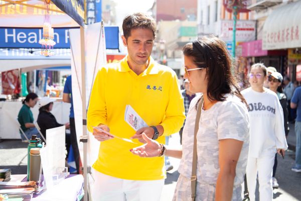 九月二十七日和二十八日,舊金山中國城中秋街會熱鬧展開,法輪功展位吸引了眾多遊客。兩天活動中,不少民眾在「制止中共活摘法輪功學員器官」徵簽表上簽名,還有的在現場學煉法輪功功法,說很喜歡學煉法輪功,感覺真的很棒。