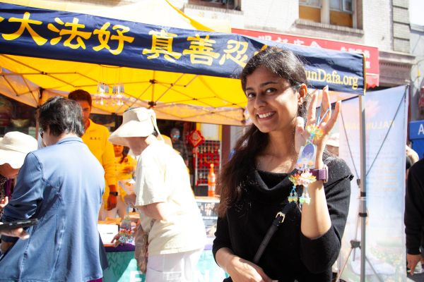 舊金山居民安基塔(Ankita)與丈夫了解法輪功後,對法輪功很感興趣,並在現場學煉。安基塔說,「這個功法很好,煉法輪功能讓我平靜下來,我感到身體變得輕鬆,不僅是外在的身體,內心也感到輕鬆,放鬆的感覺真好。」
