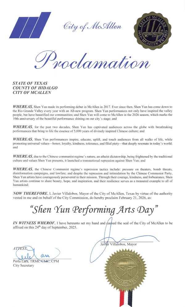二零二五年九月二十四日,美國德克薩斯州麥卡倫市市長哈維爾・維拉洛沃斯(Javier Villalobos)正式簽署公告,宣布二零二六年二月二十一日為「神韻藝術團日」(Shen Yun Performing Arts Day)。此日的演出,將迎來神韻在麥卡倫舞台上的十週年紀念,特此表彰其更加非凡的意義。