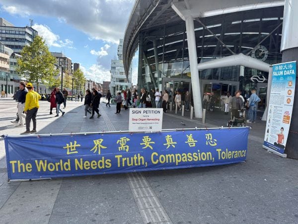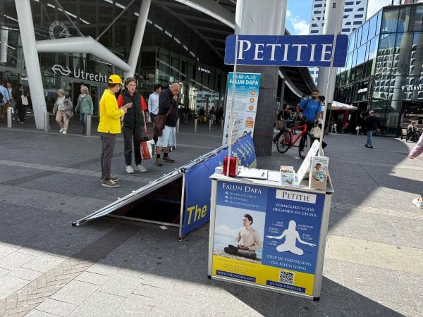 九月十四日,法輪功學員在烏得勒支市中心火車站前設立了信息展位。許多人駐足閱讀橫幅上的內容,並與法輪功學員交談,很多人第一次了解到這場迫害。