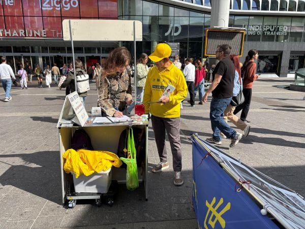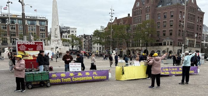 阿姆斯特丹不僅是荷蘭的首都,還擁有悠久的包容、言論自由和人權歷史,是荷蘭人和外國遊客的觀光勝地。十月三日,法輪功學員在市中心的水壩廣場設立了信息亭,許多當地人和遊客駐足了解真相。有些人被中共迫害的規模和殘酷程度所震驚,還有一些人則對法輪功學員的和平抗暴以及法輪大法真、善、忍價值觀表示支持。