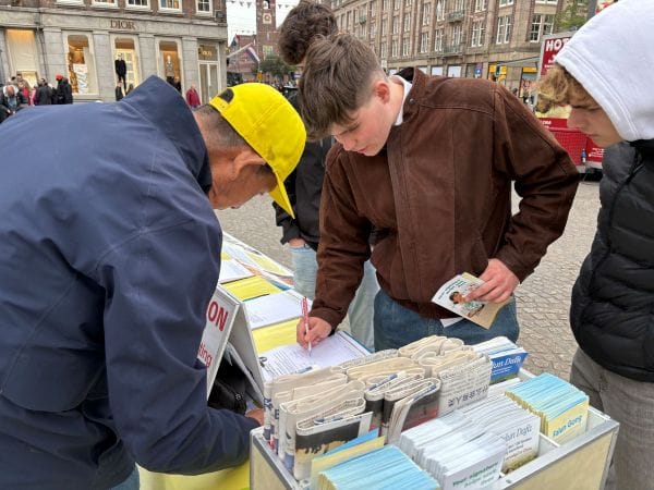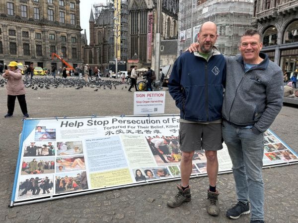 兩位荷蘭公民:質量監控員埃爾文・博文(Erwin Boven )和企業主約翰・范・巴列戈伊恩(John van Ballegooijen)停下來與法輪功學員交談,他們在呼籲停止迫害的請願書上簽了名,並讚揚法輪功學員為此做出的努力。
