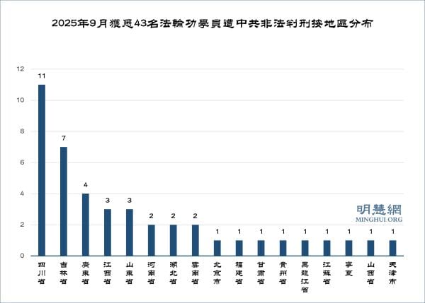 據明慧網報導統計,獲知今年九月份有43名法輪功學員被非法判刑。迫害最嚴重地區依次為:四川省11人,吉林省7人,廣東省4人,江西省、山東省各3人。河南省、湖北省、雲南省各2人,北京市、福建省、甘肅省、貴州省、黑龍江省、江蘇省、寧夏、山西省、天津市各1人。