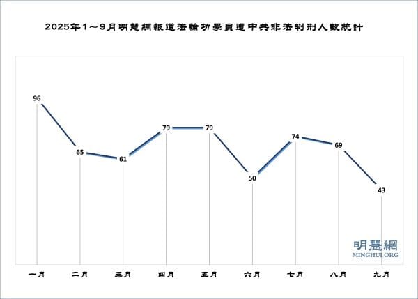 二零二五年九月份,中共以「九・三閱兵」、「十・一維穩」為藉口,對法輪功學員加緊監控、騷擾、綁架和非法判刑。據明慧網報導統計,九月份獲知,至少又有43名法輪功學員被非法判刑(其中,二零二五年38人,其它年度5人)。