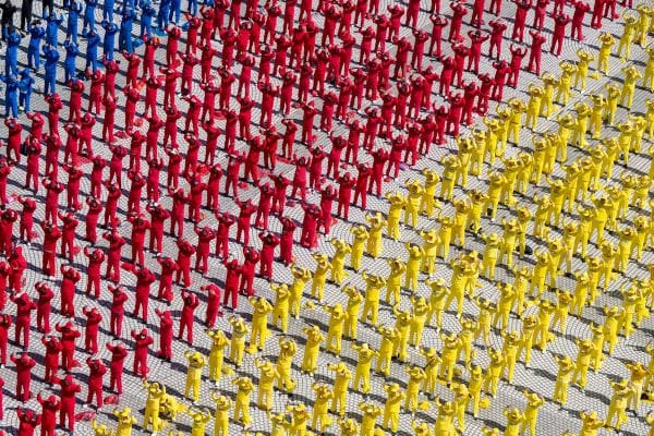 排字活動結束後,舉行集體大煉功展示五套祥和的功法,並以橫幅「法輪大法好」和「師恩浩蕩 謝謝師父」向李洪志師父表達敬意。