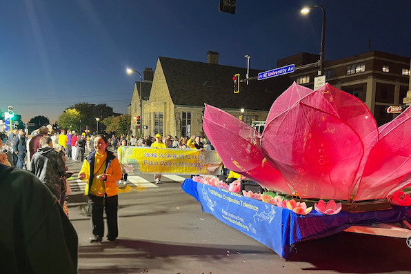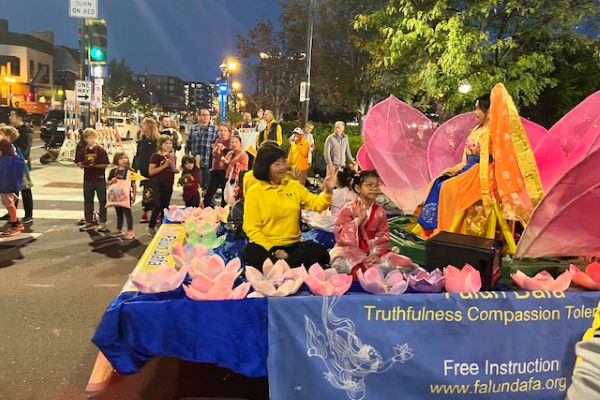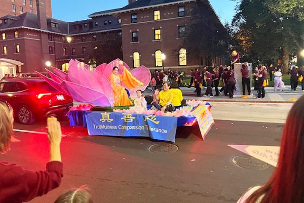 華燈初上,返校日遊行於傍晚六點半開始。法輪功俱樂部隊伍在優雅的《普度》音樂聲中緩緩前行,巨大的粉色蓮花花車上,身著漢服的小女孩和唐裝的仙女熱情的和觀眾招手,花車前後有俱樂部成員拉著法輪功的橫幅,花車兩旁還有學員給沿街觀眾贈送小蓮花和書籤。