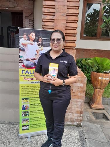 北庫塔區政府秘書普圖・拉克斯米・德維(Putu Laksmi Dewi)熱情歡迎法輪功學員教區政府工作人員學煉功法。活動結束後,她感謝學員們免費教功。