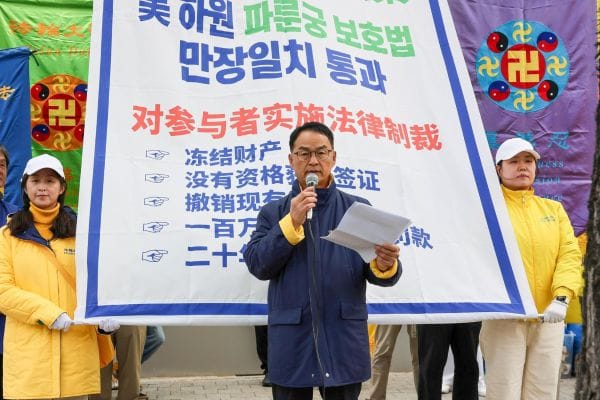 韓國法輪大法學會秘書長吳世烈在遊行出發前,在隊伍前面宣讀了學會聲明。