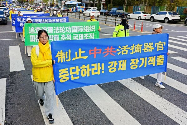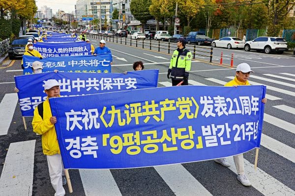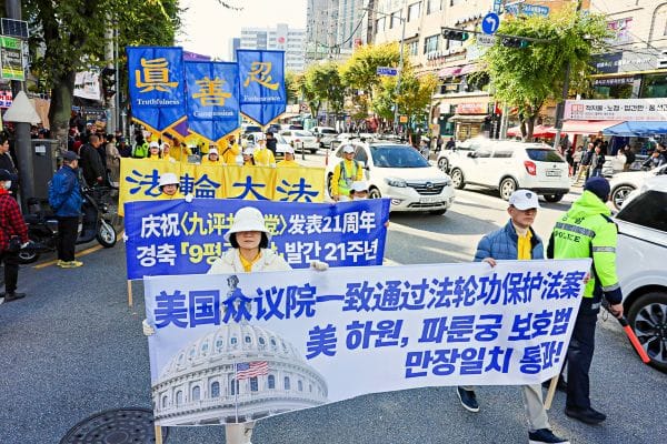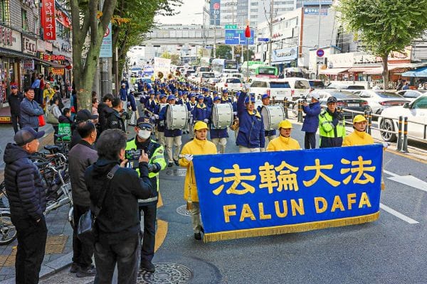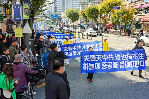 二零二五年十一月二日,韓國部分法輪功學員在首都首爾最大的華人聚居區九老洞與大林洞一帶舉行盛大遊行,慶祝4億5千萬中國人退出中共黨、團、隊(三退)組織(本文主圖)。