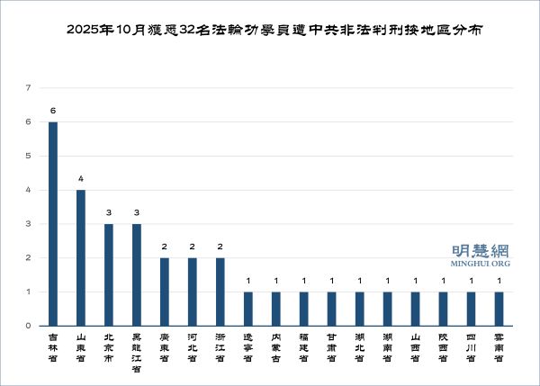 據明慧網報導統計,今年十月份獲知又有32名法輪功學員被非法判刑;有17個省、自治區、直轄市參與迫害。迫害最嚴重地區依次為:吉林省6人,山東省4人;北京市、黑龍江省各3人;廣東省、河北省、浙江省各2人。