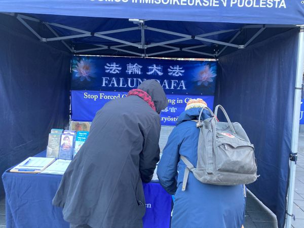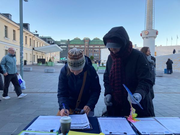 當天在赫爾辛基的康比廣場(Kamppi)附近,有學生在寒冷發抖的情況下,仍堅持簽名聲援。期間不斷聽到民眾的反饋:「我在網絡上看到,而且一直關注你們的信息。」「活摘器官完全無法接受。」「要勇敢地繼續講下去。」