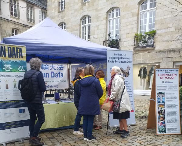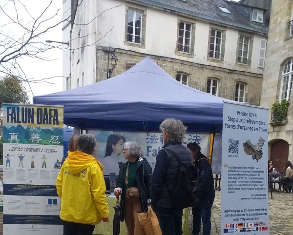 同一天,在法國布列塔尼大區西北部的藝術與歷史之城坎佩爾(Quimper)梅達爾廣場(Place Médard),法國西部的法輪功學員舉辦法輪大法信息日活動,向來往的遊人和民眾介紹法輪功、演示五套功法,同時徵簽支持G7+7請願書,制止中共的迫害罪行,許多民眾駐足關注。