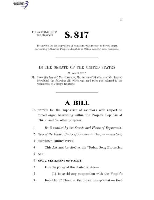 《法輪功保護法案》(S.817法案)由德克薩斯州共和黨聯邦參議員泰德・克魯茲(Ted Cruz)二零二五年三月三日提出,法案指出中共仍在參與活摘法輪功學員的器官暴行。該法案將對那些參與活摘器官的個人或共謀實施制裁,對中共追責。