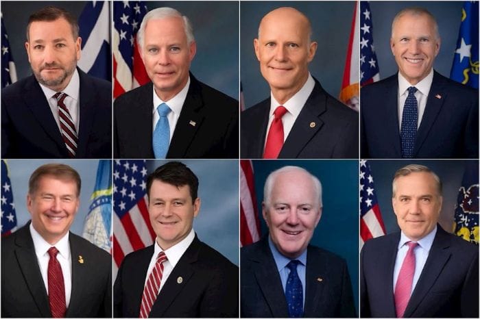 美國國會參議院《法輪功保護法案》(S.817)提案人(上圖從左至右,從上至下):主要提案人德州共和黨參議員泰德・克魯茲(Ted Cruz),共同提案人威斯康辛州共和黨聯邦參議員羅恩・約翰遜(Ron Johnson)、佛羅里達州共和黨聯邦參議員瑞克・史考特(Rick Scott)、北卡羅來納州共和黨聯邦參議員湯姆・提利斯(Thom Tillis)、南達科他州共和黨聯邦參議員麥克・朗茲(Mike Rounds)、印第安納州共和黨聯邦參議員托德・楊(Todd Young)、德州共和黨聯邦參議員約翰・科寧(John Cornyn)、賓夕法尼亞州共和黨聯邦參議員大衛・麥考爾米克(David McCormick)。