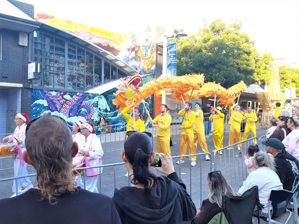 二零二五年十一月二十八日星期五傍晚,西澳西南海岸城市曼都拉(Mandurah)舉行了盛大的聖誕遊行。在遊行中,法輪功學員的遊行方陣備受矚目。觀眾盛讚:「你們是最棒的!」