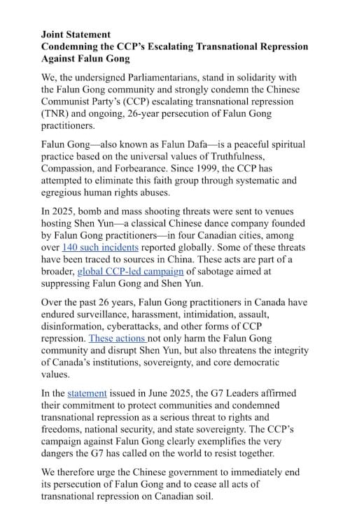 聯署中說:「我們,以下簽署的議員,聲援法輪功群體,並強烈譴責中共不斷升級的跨國鎮壓(TNR)和對法輪功學員持續26年的迫害。」