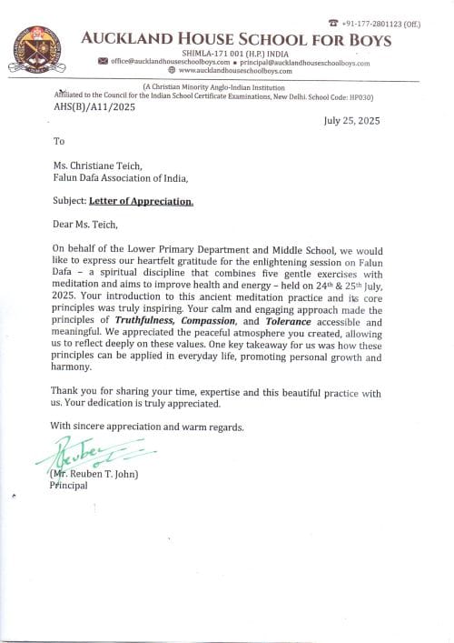 他寫道:「我謹代表學校,包括我們的學生、教職工,對您為我們學校各年級舉辦的鼓舞人心、意義深遠的法輪功教功班表示最深切的感謝。」