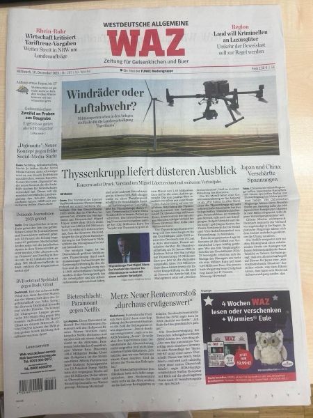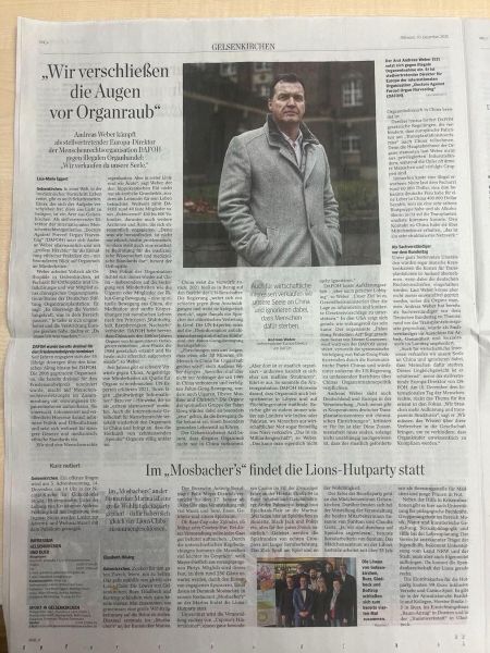 二零二五年十二月十日世界人權日之際,德國《西德意志彙報》(WAZ)在蓋爾森基興市(Gelsenkirchen)的當地報紙刊登一篇題為「我們對活摘器官視而不見」的專訪文章,呼籲德國社會不能為了經濟利益出賣靈魂,對中共活摘器官置若罔聞。