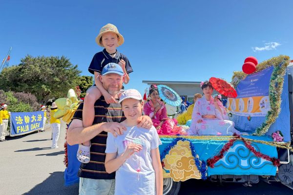 從事建築行業的迪倫(Dylan)和他的孩子們看見法輪功遊行隊伍都非常開心,他說,法輪功學員們整體看起來很棒,服裝也很漂亮。