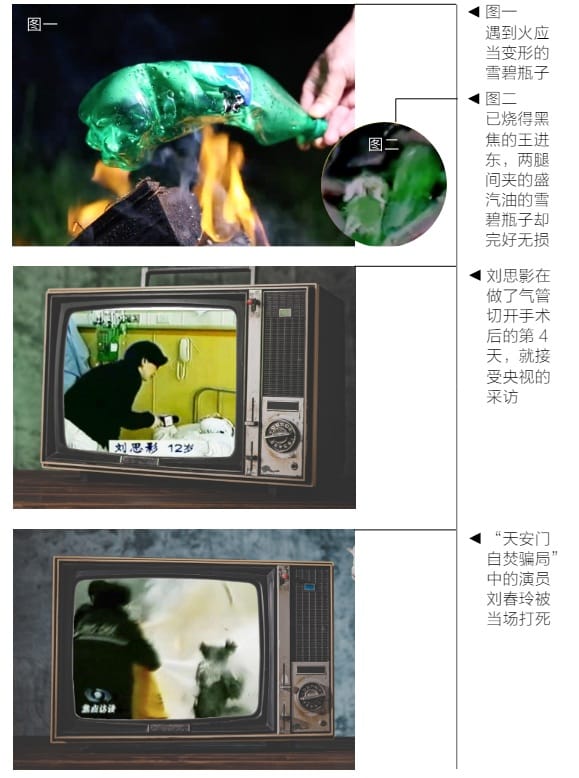 答:天安門自焚事件被廣泛認為是中共自導自演的栽贓。國際教育發展組織(IED)在聯合國揭露疑點。中共新華社錄象顯示多處疑點,例如衣服燒糊而裝滿汽油的塑料瓶放在兩腿間卻完好無損,遠景近景特寫鏡頭切換可疑,滅火毯靜垂、延遲滅火。「自焚」的受害者,其行為與法輪功修煉理念完全相違背。