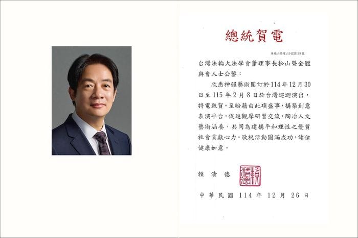 在神韻藝術團蒞臨台灣前夕,中華民國總統賴清德在賀電中表示,「欣悉神韻藝術團訂於114年(2025年)12月30日至115年2月8日於台灣巡迴演出,特電致賀。至盼借由此項盛事,構築創意表演平台,促進觀摩研習交流,陶冶人文藝術涵養,共同為建構平和理性之優質社會貢獻心力。」