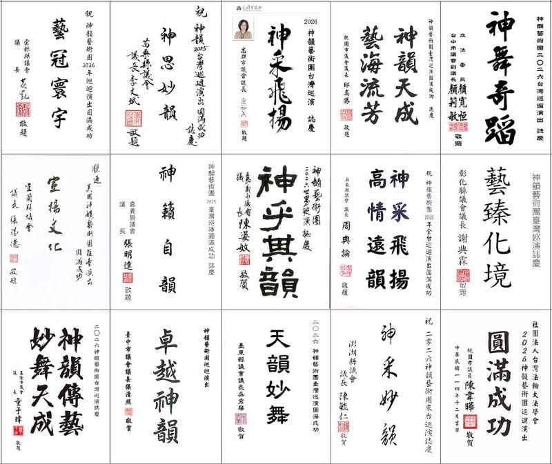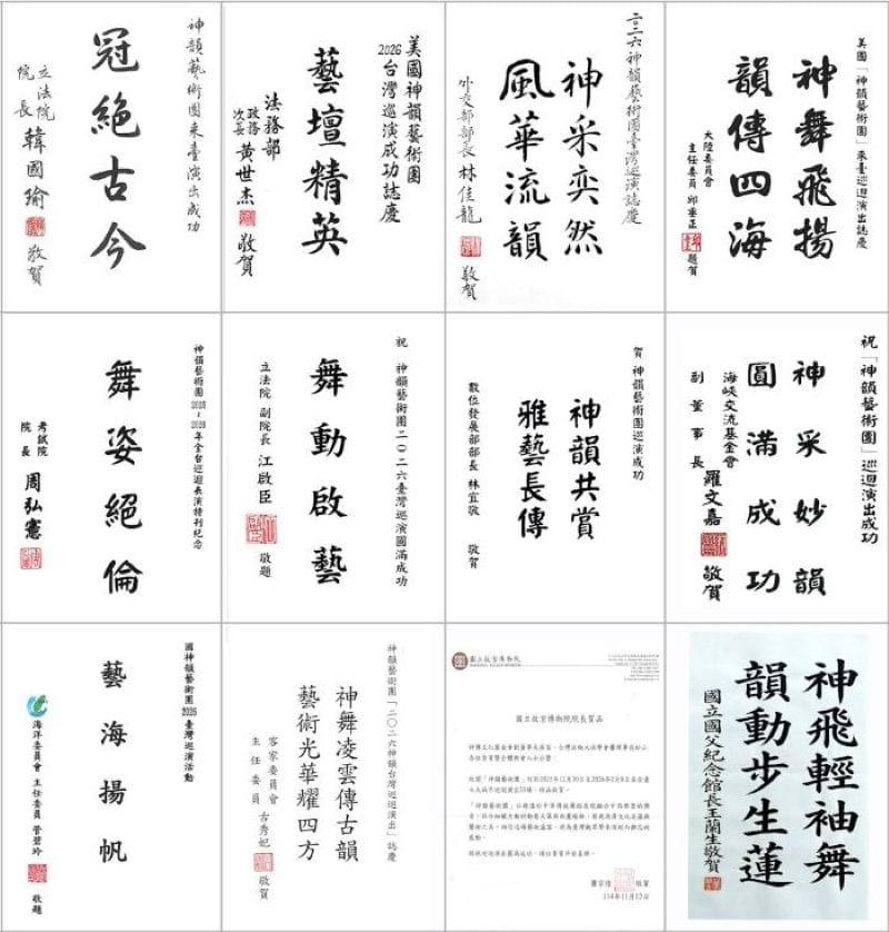 主掌兩岸關係的部會首長們也熱情迎接神韻的到來,陸委會主委邱垂正以「神舞飛揚 韻傳四海」祝賀;海基會副董事長兼秘書長羅文嘉也送上「神采妙韻 圓滿成功」的祝福。