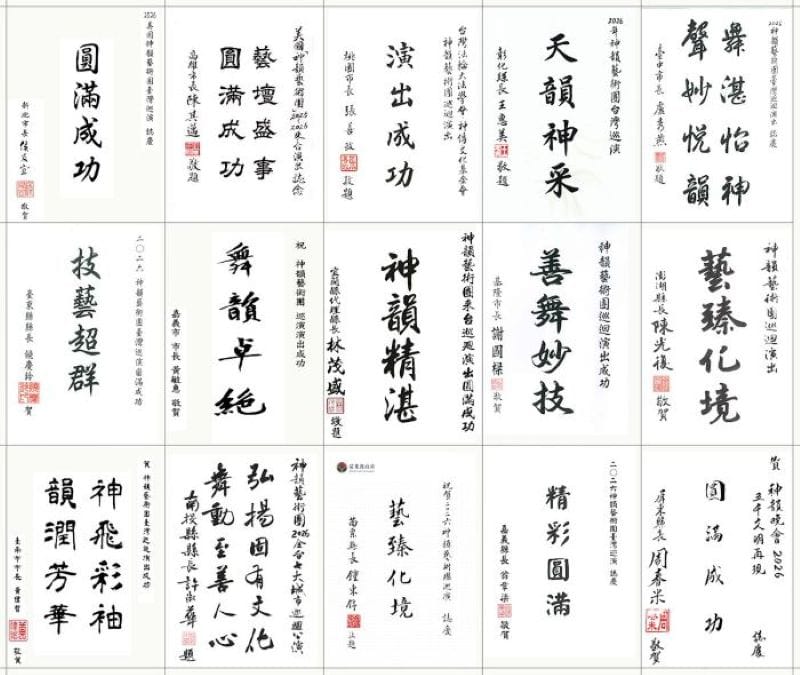 神韻今年將在台灣七大城市演出三十三場,十九位各地方政府首長以地主身份歡迎神韻到來。五位直轄市首長,包括新北市長侯友宜、桃園市長張善政祝賀演出圓滿成功;台中市長盧秀燕讚神韻是「舞湛怡神,聲妙悅韻」;台南市長黃偉哲題贈「神飛彩袖,韻潤芳華」;高雄市長陳其邁也祝賀神韻「藝壇盛事,圓滿成功」。