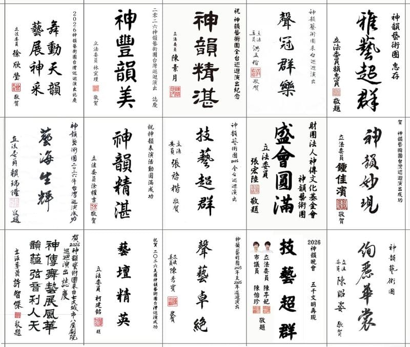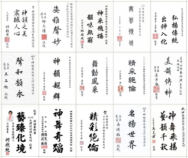 神韻「世界第一秀」的頂級口碑在台灣主流精英圈廣為流傳,每年均吸引大批政要名人入場觀賞,諸多國會議員也紛紛致贈賀詞,讚賞和迎接神韻的到來,今年計有七十位。包括立法委員王定宇讚神韻「舞藝傾城」;立法委員沈伯洋祝神韻「圓滿成功」;立法委員吳思瑤讚神韻「聲藝卓絕」;立法委員何欣純讚神韻「藝臻化境」;立法委員邱志偉題贈「姿雅薺妙」;立法委員許智傑以「神傳舞藝展風華,韻蘊弦音利人天」歡迎神韻;立法委員賴瑞隆讚神韻「藝海生輝」;立法委員鐘佳濱讚歎神韻「神韻妙現」;立法委員蘇巧慧稱讚神韻「傳道宏藝」。(節選)
