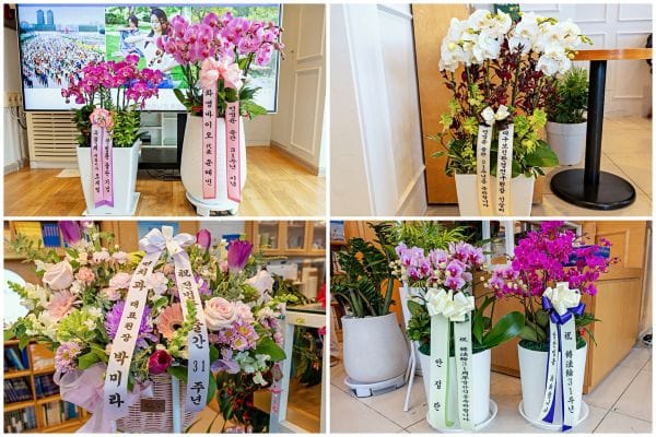 當地法輪功學員贈送了花籃,表達自己的感恩。他們來自各行各業,有生物公司的CEO,牙科診所主任和大邱市健康與環境研究所所長等。來自全國各地的五十餘名參與者齊聲朗讀《轉法輪》,並分享自己修煉後發生的變化。部分學員通過視頻分享修煉心得,很多人都表達了對結緣《轉法輪》的感恩之情,現場不時傳來歡笑聲、驚歎聲。