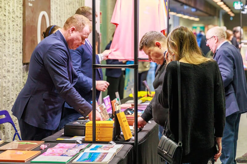 神韻波蘭站巡迴演出期間,法輪大法書籍展位的義工向觀眾介紹《轉法輪》。(大紀元)