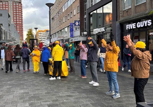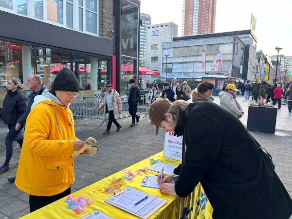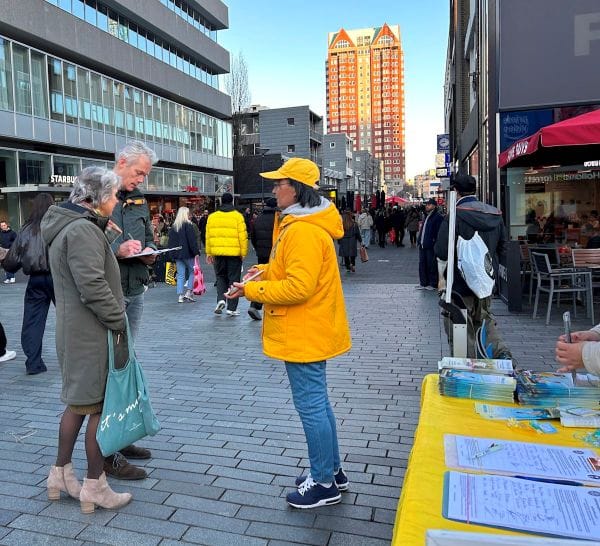 攝影愛好者登布蘭德利用週末時間到鹿特丹街頭採風。經過法輪功真相點,他直接走過來簽字,他說在網上看到了法輪功被迫害的消息,所以要簽名支持反迫害。學員向他致謝,同時向他簡單介紹法輪功,並請他幫助傳播真相,他欣然同意。
