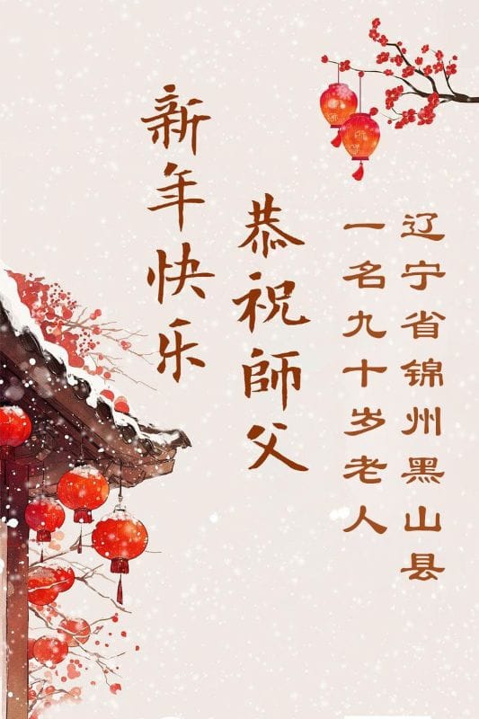 遼寧省錦州市黑山縣一名九十歲老人恭祝李大師新年快樂!