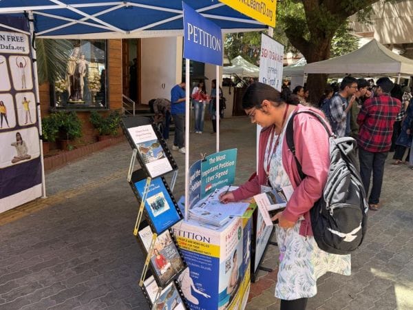 法輪大法學員在活動現場設立了信息展位,向參加藝術節活動的師生介紹法輪大法,這也是延續多年的傳統。今年學員們還在展位上徵集簽名,呼籲制止中共對法輪功學員實施的活摘器官和酷刑,旨在喚起學生對這一罪行的關注,促進深入思考與交流。展位吸引了大量人群,包括教授、行政管理人員、教師、各校學生、警務人員等。
