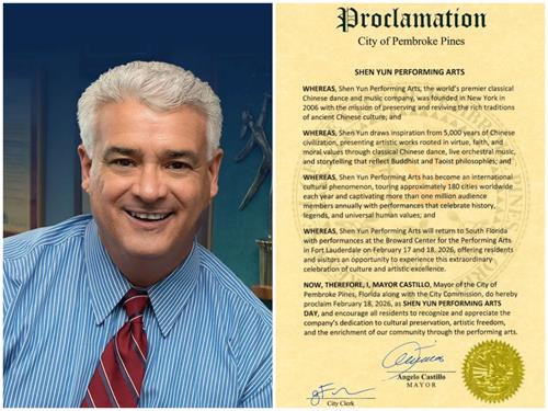 二零二六年二月十八日下午,佛羅里達彭布羅克派恩斯市(Pembroke Pines)市長安傑洛・卡斯蒂略(Angelo Castillo)在市政廳向法輪功學員代表頒發了對神韻藝術團的褒獎,表彰神韻藝術團「通過表演藝術豐富社區文化生活方面所作出的貢獻」。