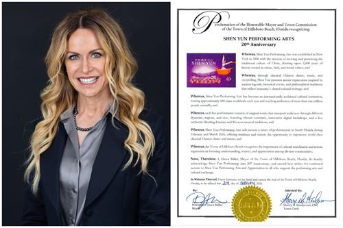 佛羅里達州希爾斯伯勒海灘鎮(Hillsboro Beach)的市長道恩・米勒( Dawn Miller)及鎮委員會也發來褒獎,祝賀神韻藝術團成立二十週年,感謝神韻為當地居民及遊客帶來的世界一流中國古典舞與音樂,並向神韻藝術團致以誠摯祝賀,祝願其不斷取得成功。