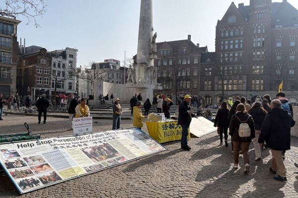 二零二六年三月八日,荷蘭阿姆斯特丹的法輪功學員在達姆廣場國家紀念碑附近舉行活動,向民眾介紹法輪功的美好,並揭露中共對法輪功的迫害。