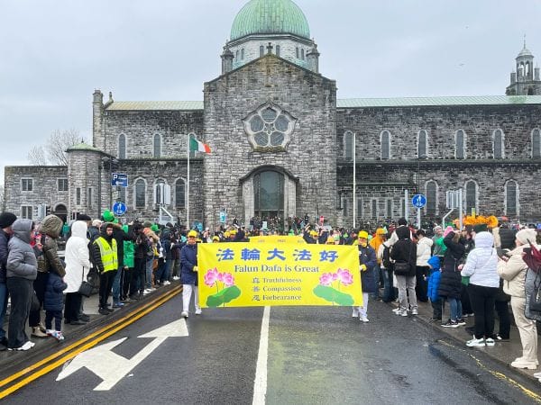 當天,愛爾蘭法輪功學員應邀參加遊行,為觀眾傳遞真、善、忍的美好理念。方陣以「法輪大法好」橫幅開道,隨後是祥和的功法展示、柔美的蓮花舞以及歡騰的金龍表演。沿途掌聲與歡呼聲不斷,民眾熱情揮手致意。不少中國大陸遊客在看到隊伍時驚喜地輕聲說道:「法輪大法!」很多華人舉起手機記錄這一盛況。