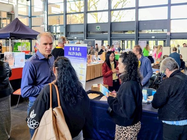 二零二六年三月二十二日,比利時法輪功學員參加亨克市舉辦的「春季精神綻放博覽會」,學員在展示廳使用投影向參觀者介紹法輪功,以及中共對法輪功的殘酷迫害。在眾多展台中,法輪功學員的展台受到民眾的讚賞和青睞。