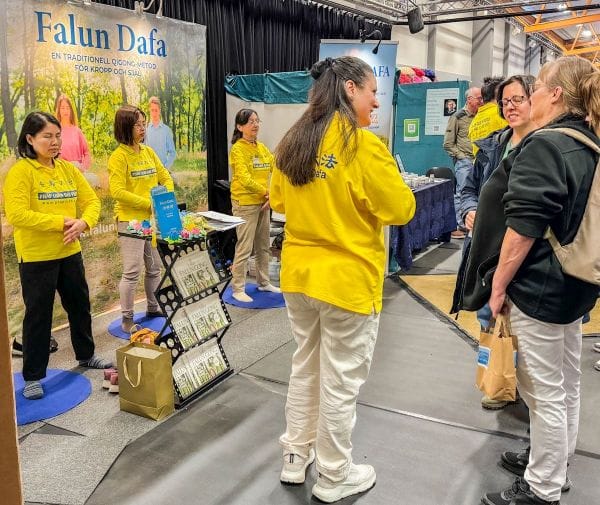 法輪功學員在瑞典最大的健康博覽會設立展台介紹法輪功。