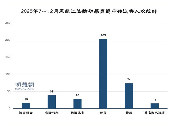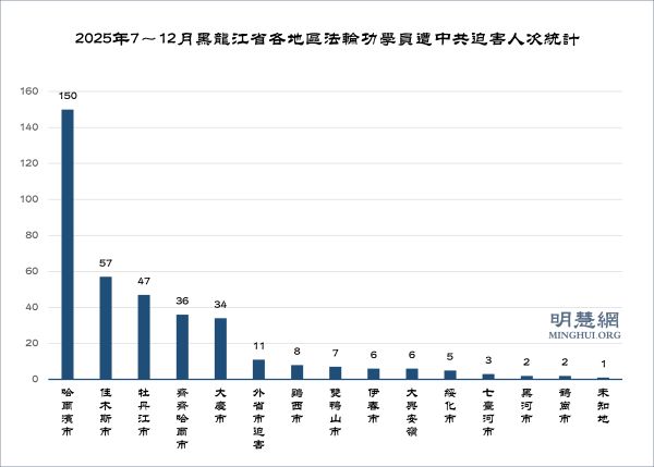 根據明慧網數據統計,二零二五年七月一日至二零二五年十二月三十一日,黑龍江省十二個地級市、一個地區法輪功學員被中共用各種手段迫害,總計375人次。其中16人含冤離世;39人被非法判刑、勒索罰金總計21.9萬元;非法批捕、起訴、庭審28人次;