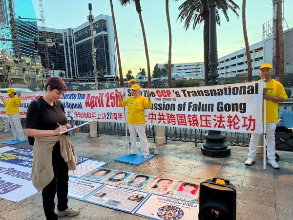 當天傍晚的活動現場,學員們支起帳篷,掛起真相條幅,醒目的文字內容吸引了賭城大道上往來穿梭的人群。他們有的駐足觀看;有的接過學員發放的真相傳單,和學員交流,了解究竟發生了甚麼;也有的在徵簽表上簽名,支持學員反迫害。點擊閲讀明慧網原文。
