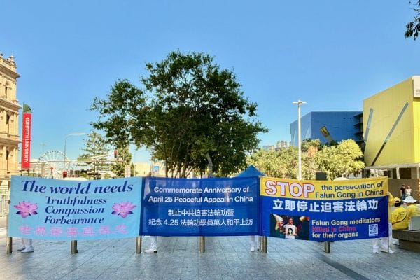 二零二六年四月十八日,澳洲昆士蘭法輪功學員在布里斯班廣場(Brisbane Square)舉行了集體煉功、橫幅展和講真相活動,紀念四・二五法輪功學員和平上訪二十七週年。