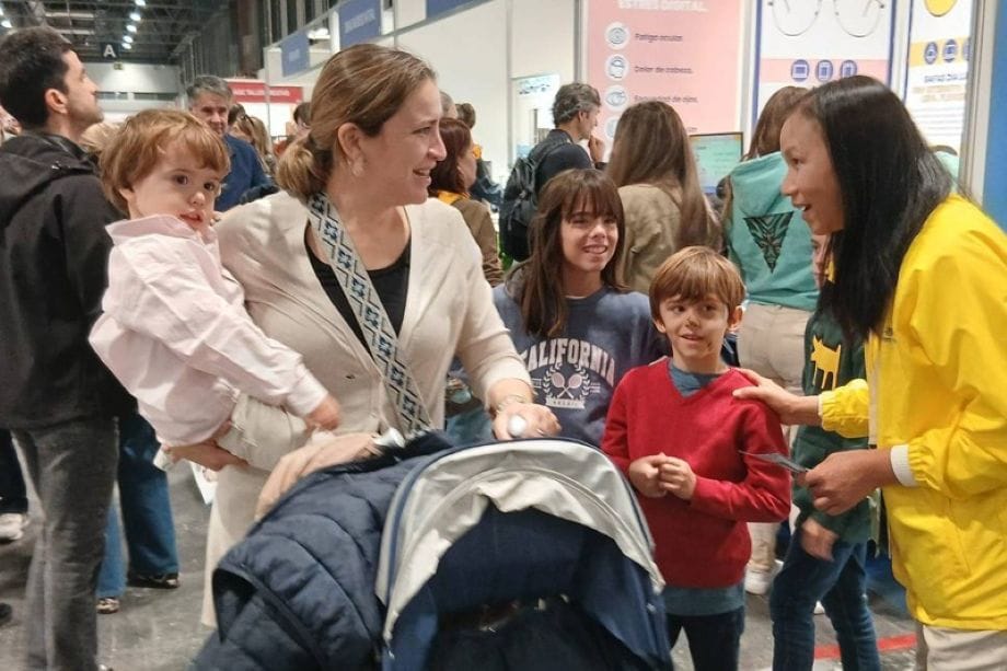 马德里健康博览会上,一位女士带著四个孩子停在法轮大法展位前。孩子们被功法的优美动作吸引,主动提出想学炼,母亲也拍下画面,并表示:「有缘结识法轮功,是我和孩子们这次博览会之行最有意义的一件事。」