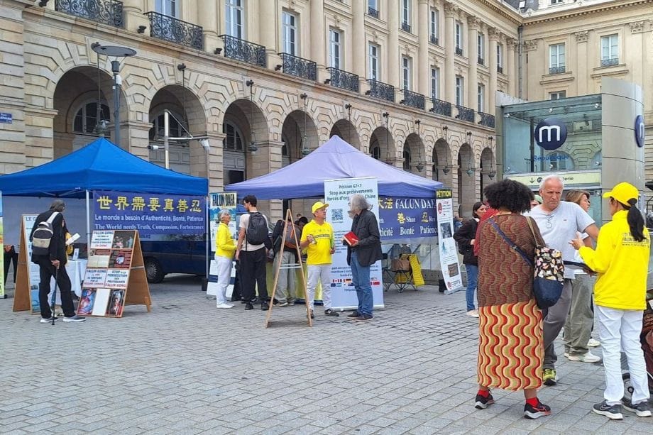 法國布列塔尼大區首府雷恩市共和國廣場上,一行人正趕往市政廳參加婚禮。接到反對中共活摘器官請願書時,起初說時間緊,聽完法輪功學員說明後,卻紛紛停下腳步表示:「必須簽,這太嚴重了!」