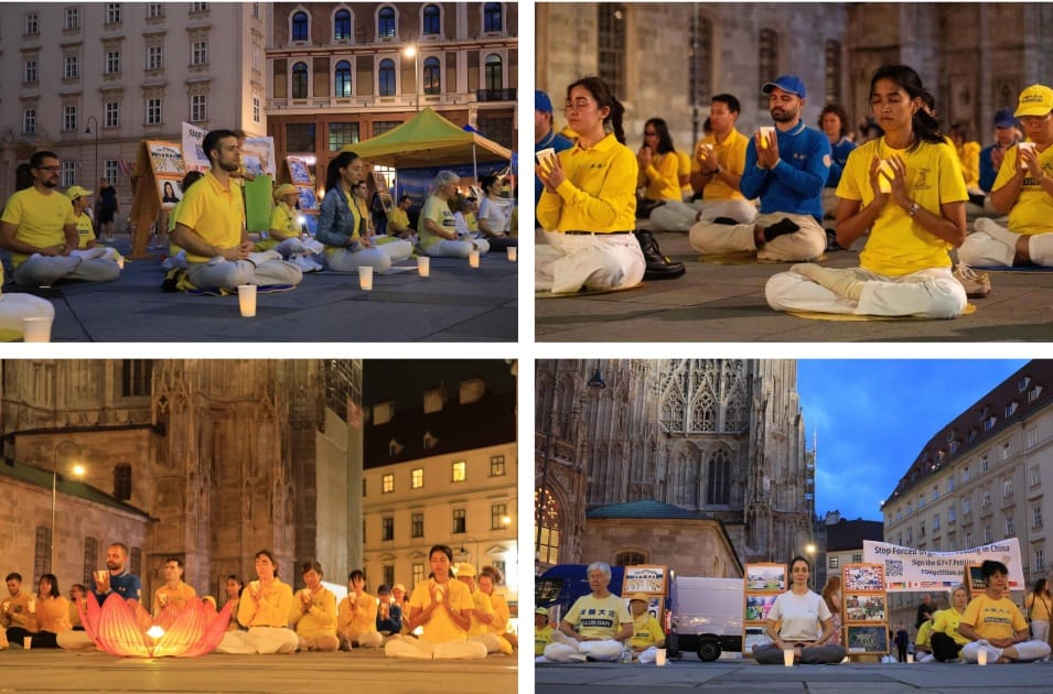 二零二五年八月二十九和三十日,在奧地利首都維也納,來自歐洲十幾個國家的部分法輪功學員在市中心舉辦了包括集會、燭光夜悼和遊行在内的大型講真相系列活動。